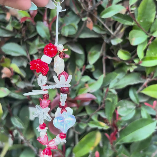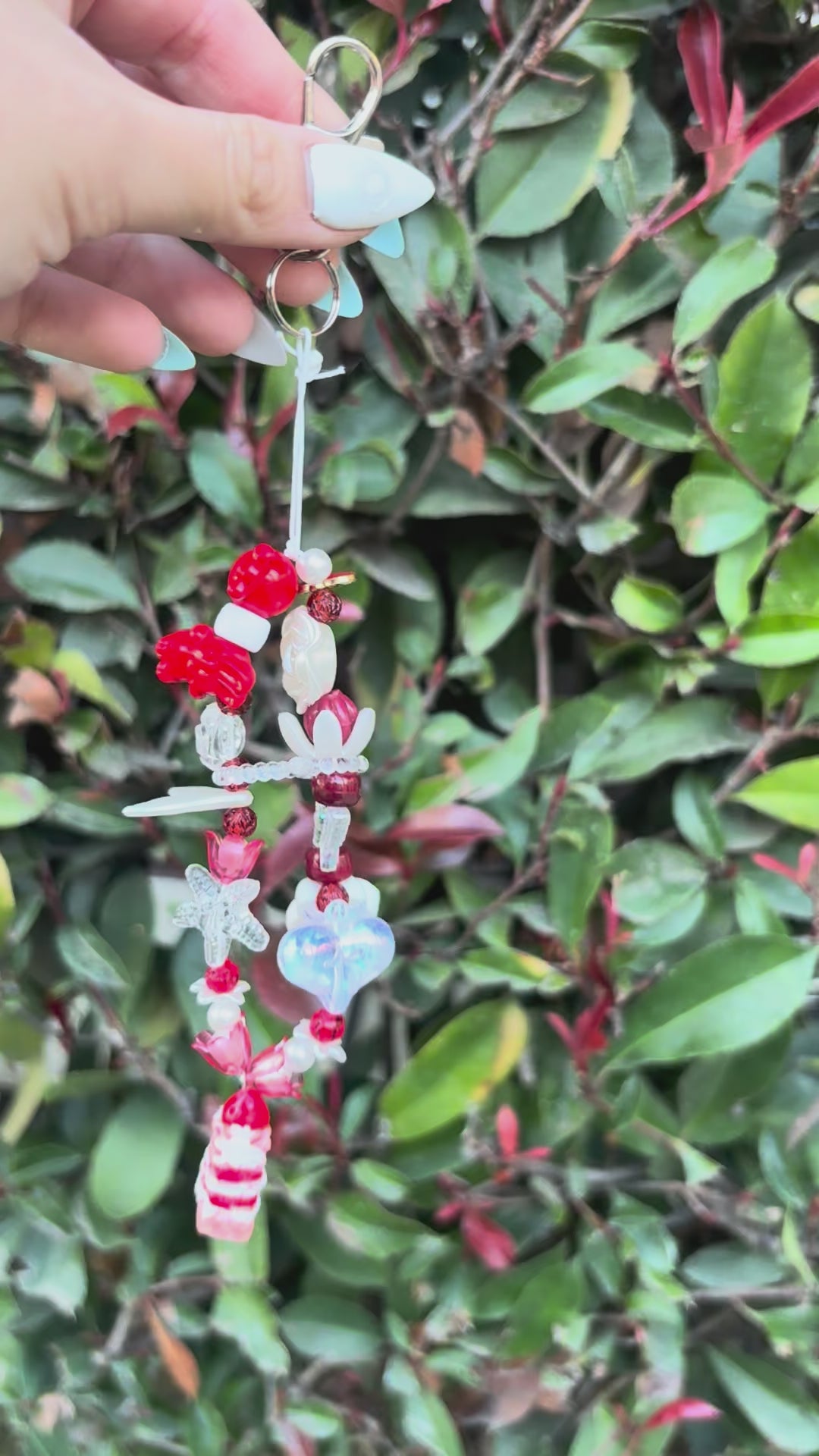 (5/6)One of a kind charm keychain in red and white with bunny and cake including butterflies, flowers, star fish, and hearts.