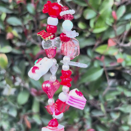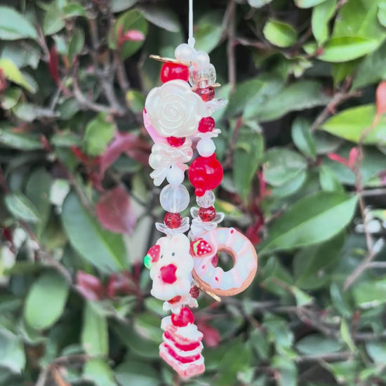 (4/6)One of a kind charm keychain in red and white with cake and bunny including bows, flowers, donuts, and candy.