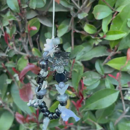 (2/2)One of a kind charm keychain in black and white with kitty and kuromi including dolphin, bows, flowers, stars, and hearts.