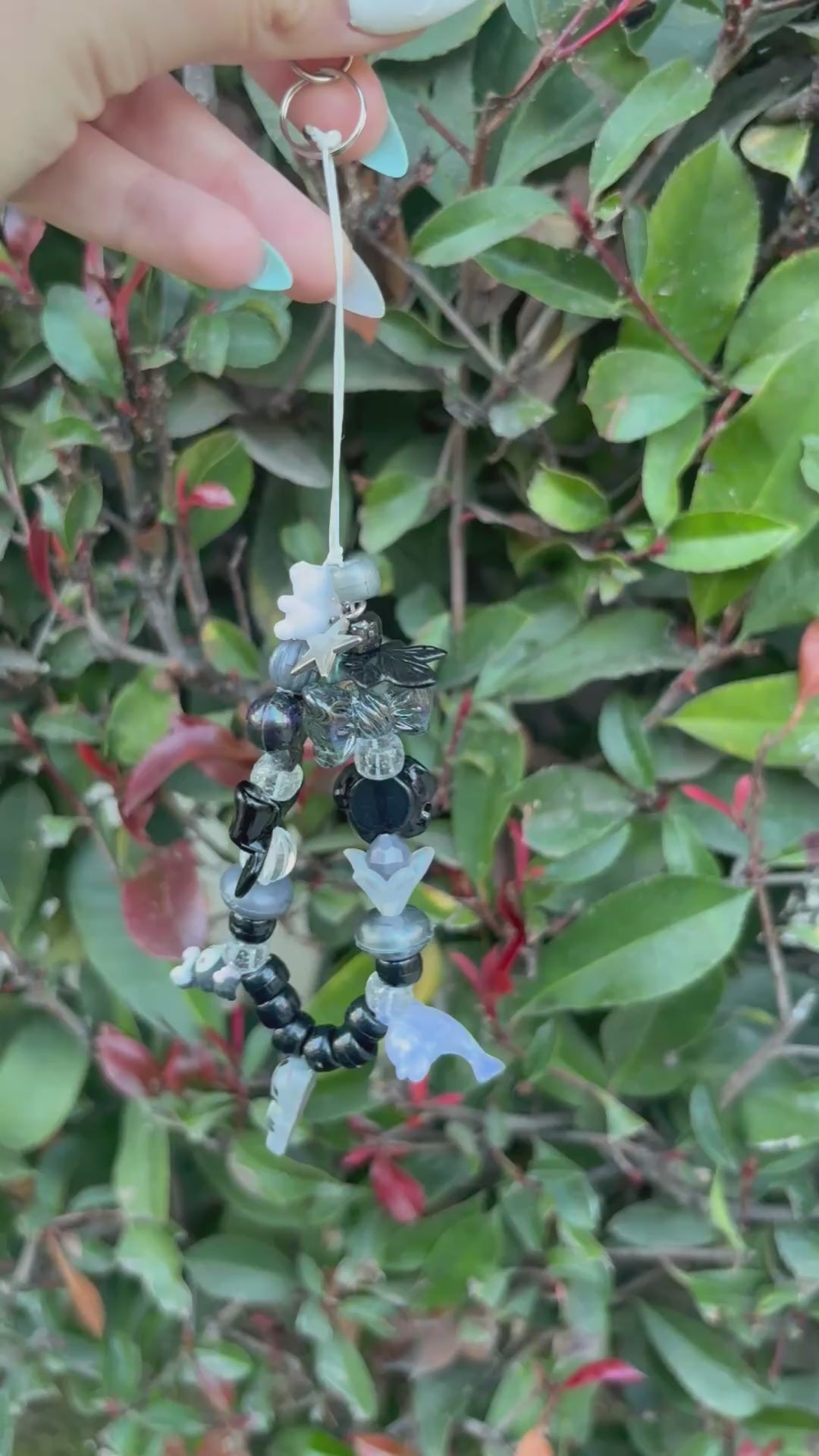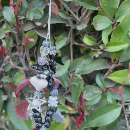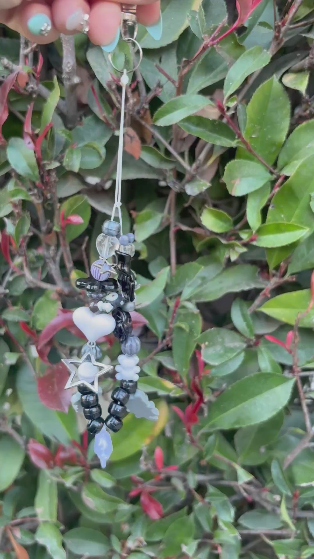 (1/2)One of a kind charm keychain in black and white with kitty and kuromi including stars, hearts dolphin, and koala.