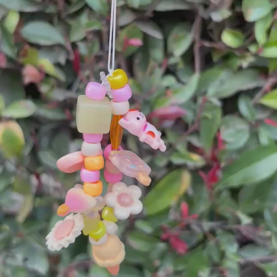(4/4)One of a kind charm keychain in yellow and pink with ice cream cone and pompompurin including kitty, flowers, ice cream bar and hearts
