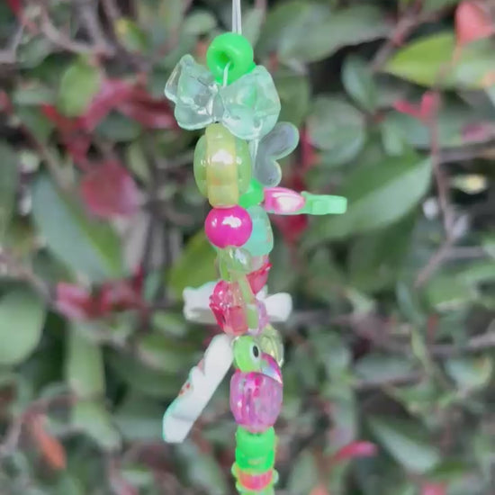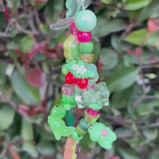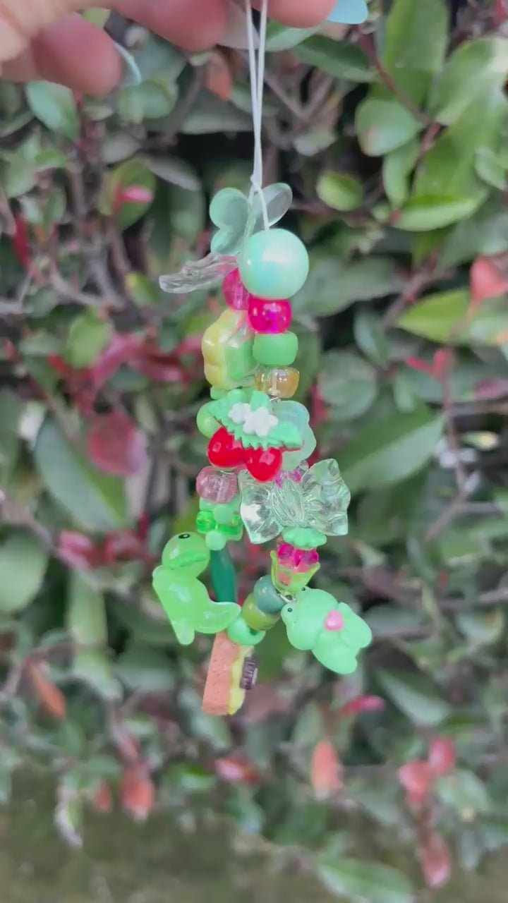 (1/3)One of a kind charm keychain in green and pink with frog and donut including bows, axolotl butterflies, stars, and evil eye protection.